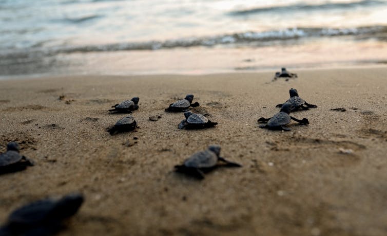 Humans can best protect sea turtle hatchlings as they make their way from the beach to the sea if they know precisely when the baby turtles will appear. But predicting emergence has been difficult. We found that by placing a simple sensor disguised as a turtle egg in the nest, we could detect activity in the nest that indicated when the baby turtles would emerge from the sand and swarm toward the water. https://www.youtube.com/embed/t-KmQ6pGxg4?wmode=transparent&start=0 Every living sea turtle has survived daunting odds, including its first journey from the nest to the ocean.